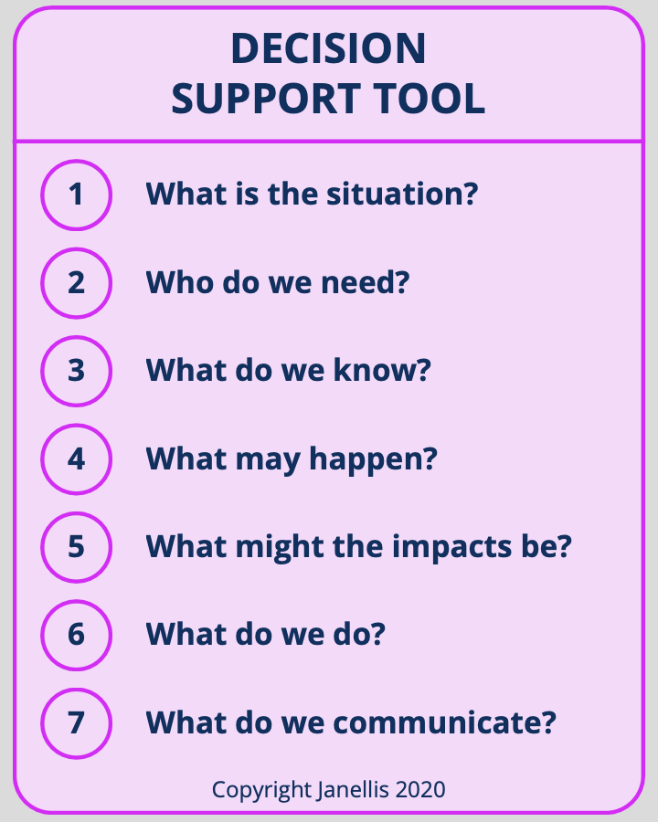 These steps come from the Janellis 7-step decision support tool, which helps leaders move from reactive decision-making to more informed, objective processes.